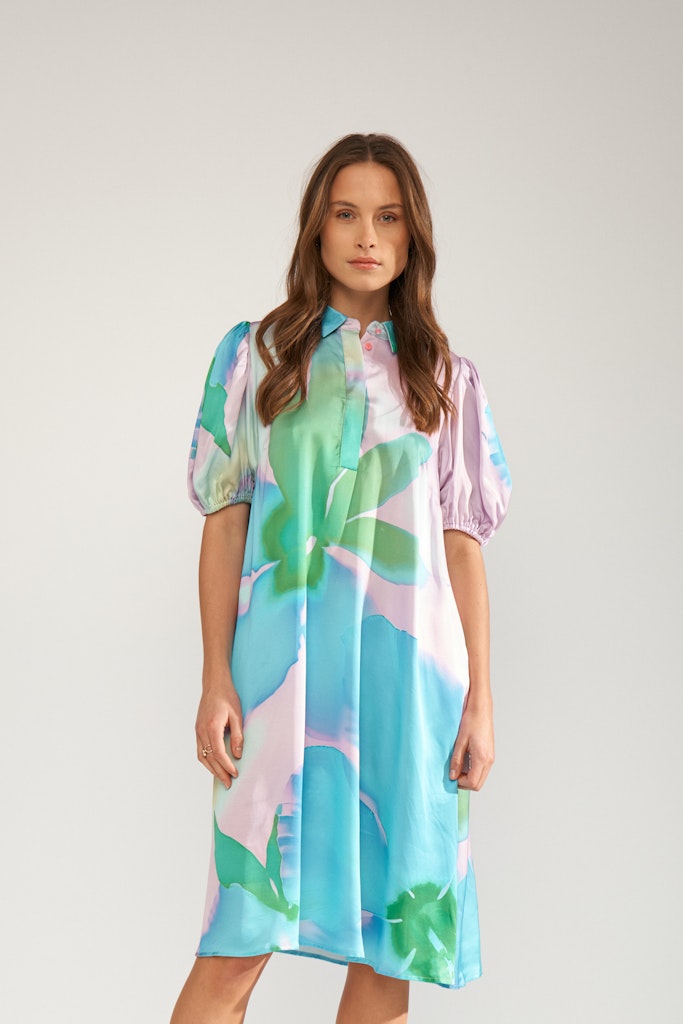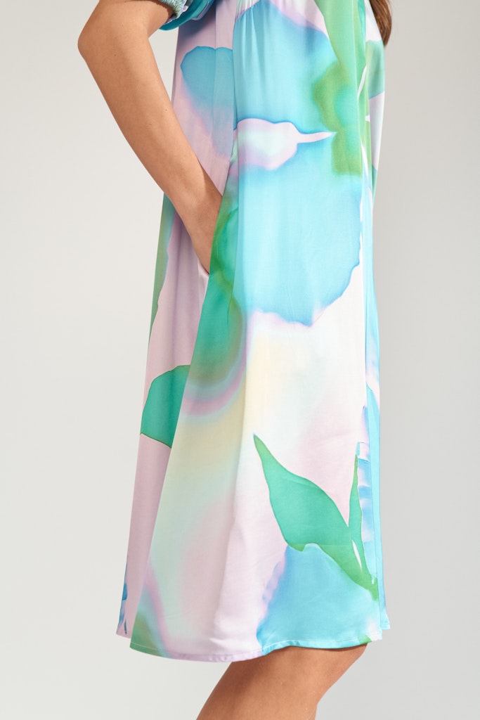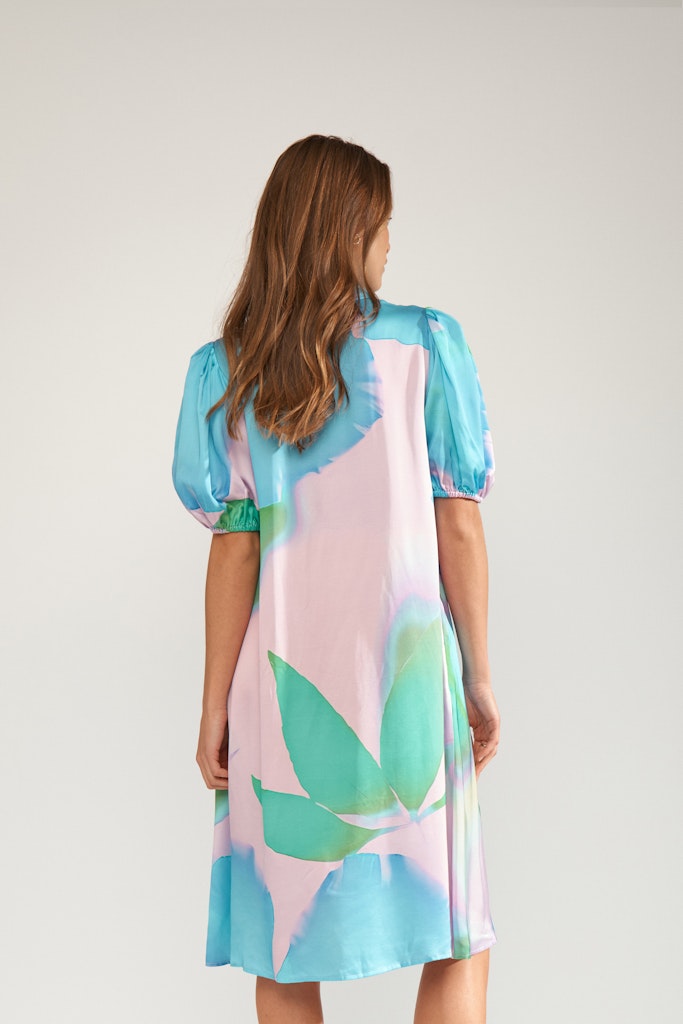 Skøn kjole fra NÜMPH med et kunstnerisk akvarelprint i grønne, blå og rosa nuancer, der skaber et levende og feminint udtryk. Farverne flyder blødt sammen og giver kjolen et elegant, håndmalet look.