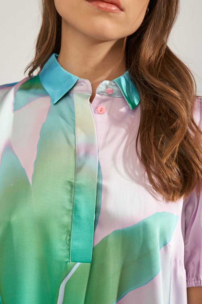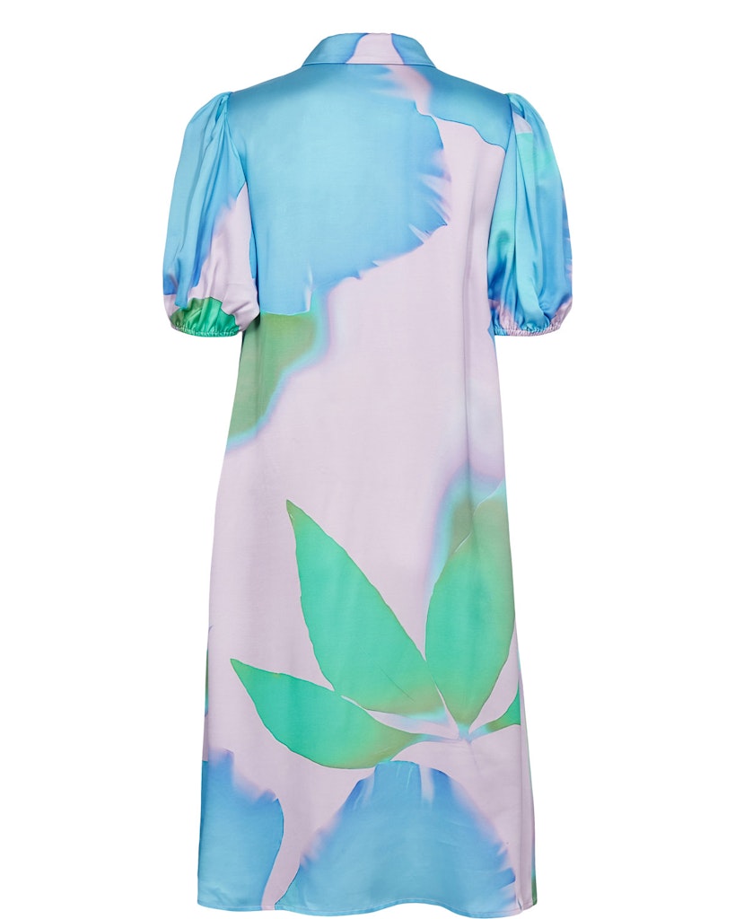 Kjolen har en A‑formet silhuet, som falder flot og let om kroppen. De korte puffærmer afsluttes med elastik, der giver både volume og komfort. Designet fuldendes af en klassisk skjortekrave med kort stolpelukning foran, som tilfører et sofistikeret touch.