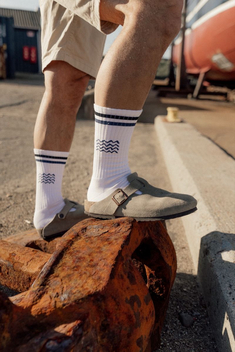 Klassiske hvide tennisstrømper med et diskret broderet bølgemotiv, der giver et rent og maritimt look i ægte LAKOR‑stil. Strømperne er bløde og åndbare og har ekstra forstærkning ved hæl og tå, hvilket sikrer god komfort og lang holdbarhed – perfekt til både hverdagsbrug og aktive dage.