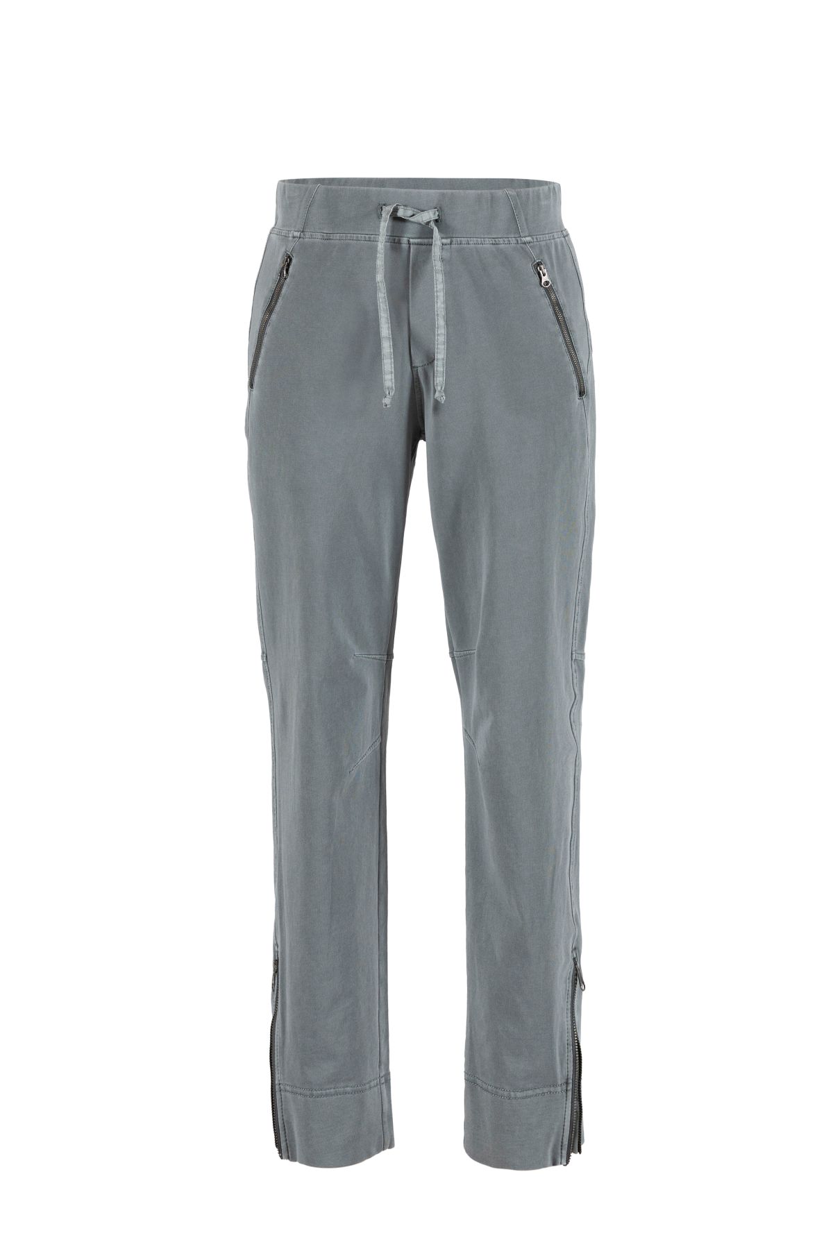 Bukserne har en bred elastik i taljen med bindebånd, som giver mulighed for at justere pasformen efter behov. De er designet med skrålommer med lynlås foran samt to baglommer med klap, der tilfører et funktionelt og gennemtænkt udtryk. Nederst på benene er der lynlåse med indvendigt stof, som sikrer, at bukserne falder pænt og ikke blæser op.