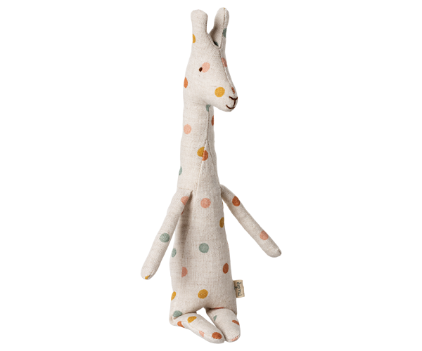 En charmerende giraf i hør med farverige prikker spredt over hele kroppen. Den har et mildt og venligt udtryk, som gør den nem at holde af – og den fine størrelse passer perfekt til små hænder, der gerne vil kramme, lege og tage den med overalt.