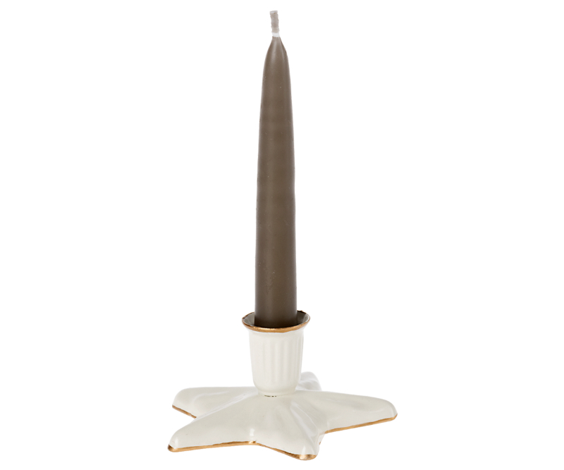 Fin lille lysestage til kertelys. Lysestagen er stjerneformet og med guldfarve rundt i kanten. Den har små riller og bare generelt en yndig form. Kan bruges hele året - sommer, efterår, jul og nytår.
