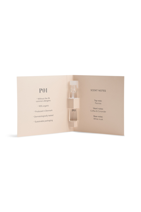 P01 er en klassisk og elegant duft med noter af bløde pæoner, varm kaffe, krydret koriander og afrundende hvid moskus. Resultatet er en feminin duft med en let friskhed og en blød, harmonisk dybde – enkel, men karakterfuld.