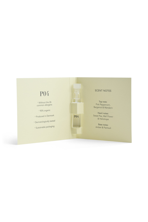 P04 er en varm og indbydende duft, der samtidig rummer en frisk og let sødme. De sprøde citrusnoter fra bergamot og mandarin giver et friskt første indtryk, som smelter sammen med bløde blomster som sød ært og vægblomst. Duften afrundes elegant med dybe og krydrede basenoter af rav og patchouli, der giver varme og karakter.