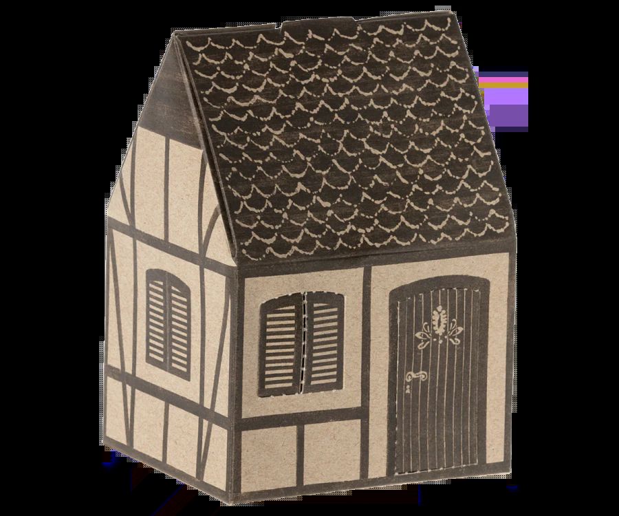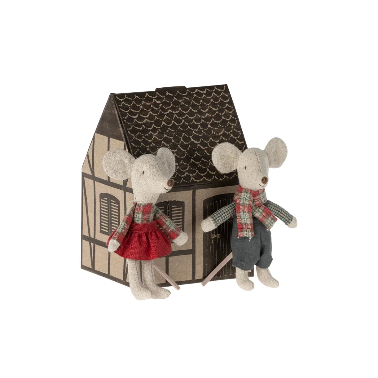 Maileg tvillinger - mus i juletøj. Der medfølger et paphus, hvor vinduer og dører kan presses op og huset kan også åbnes i toppen. Her er til mange timers leg.