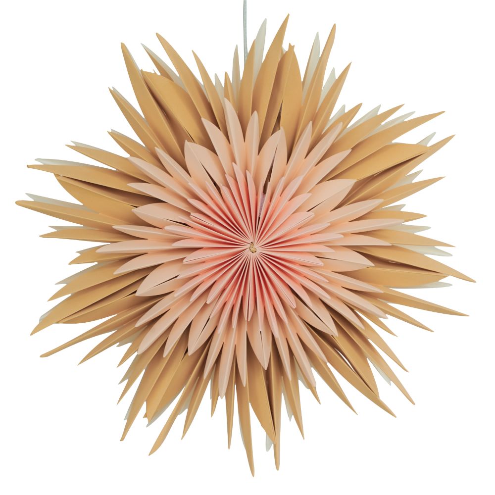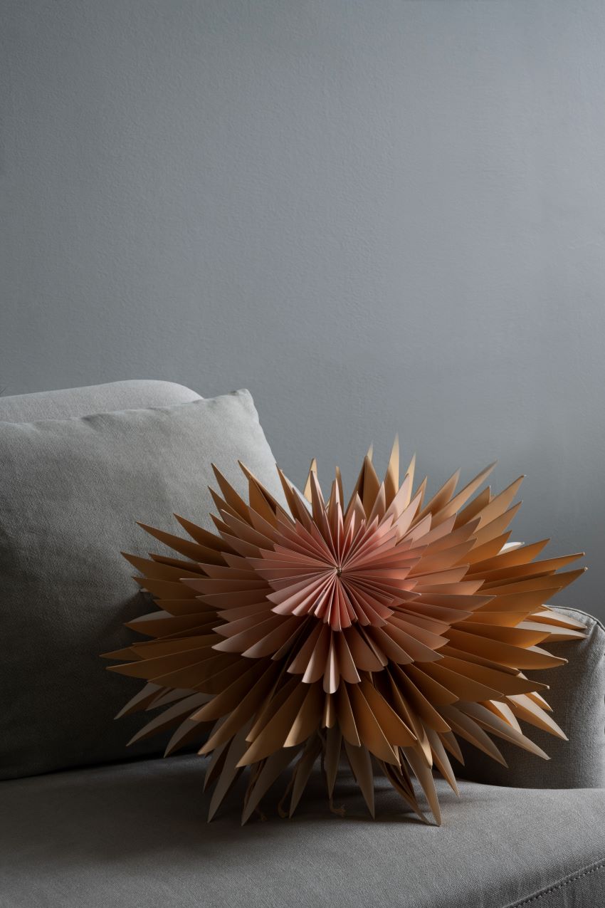 Maja er en fusion af papirstjernerne Eldig og Snöblomma fra Watt & Veke. Stjernen er kraftfuld og selvhævdende - måske som personen, der køber hende? Stjernens stærke karakter kommer fra det tykke papir, der er brugt. Stjernen er forsigtigt foldet i hånden. Den leveres i en hvid og elegant æske, hvor du også kan opbevare den, når den skal pakkes ned. Den er nu kommet i en lidt mindre model - nemlig i en diameter på 50 cm og i 3 flotte farver: orange, greige og offwhite. De lidt mindre stjerne passer til mindre rum og mindre vinduer.