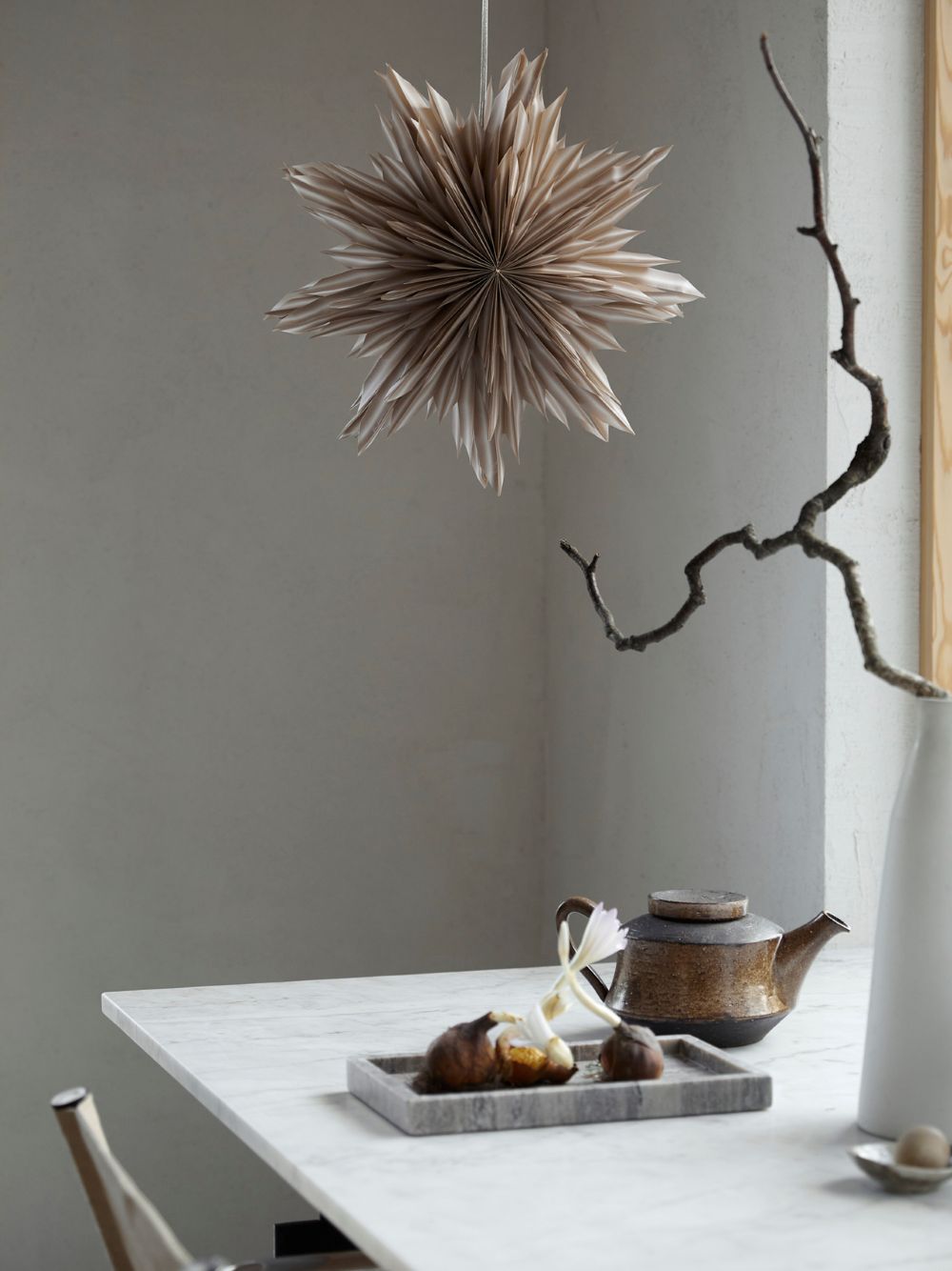 En beige stjerne fra svenske Watt & Veke, som er håndlavet i Indien. Helena er lavet af semitransperent papir med en særlig ombréeffekt i grøn, som skaber en helt særlig dybde. Helena stjernen er flot at hænge i vinduet og især, når mørket falder på og der kommer lys i den, vil den være en fryd for øjet - både for dem der er inde og dem, der går forbi huset. Eller bare dejligt, når man kommer hjem til sit mørke hus om aftenen og se, der er lys i stjerne, vil bringe glæde for alle. En beige stjerne vil være smuk i et hjem md naturlige materiale, som træ, kurve og brune farver.