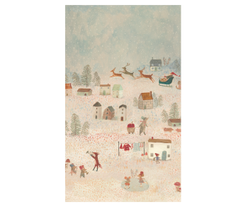 Dette print på gavepapiret kommer fra Dorthe Mailils håndlavede tegninger. Et smukt juleprint med nisser og snelandskab, og hvor julemanden kommer i sin kane.