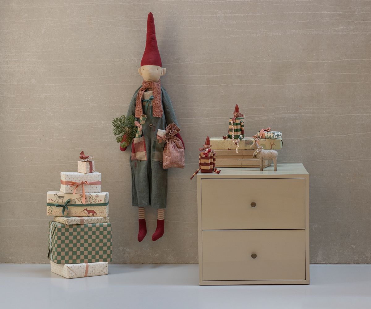 En adventskalendernisse fra Maileg til 4 mindre pakker, som bindes på en lille ring. Traditionen med advent, hvor vi hygger og tænder lys i adventskransen og giver en adventsgave de sidste 4 søndage før jul, er lang og stemningsfuld. Nissedrengen er skøn, hvis du går ind for kun 4 pakker inden jul og ikke 24, som man også kan købe. Nissedrengen er så fin med en grå dragt med 2 ternede lommer på fronten, rødt halstørklæde og en rødternet pose.