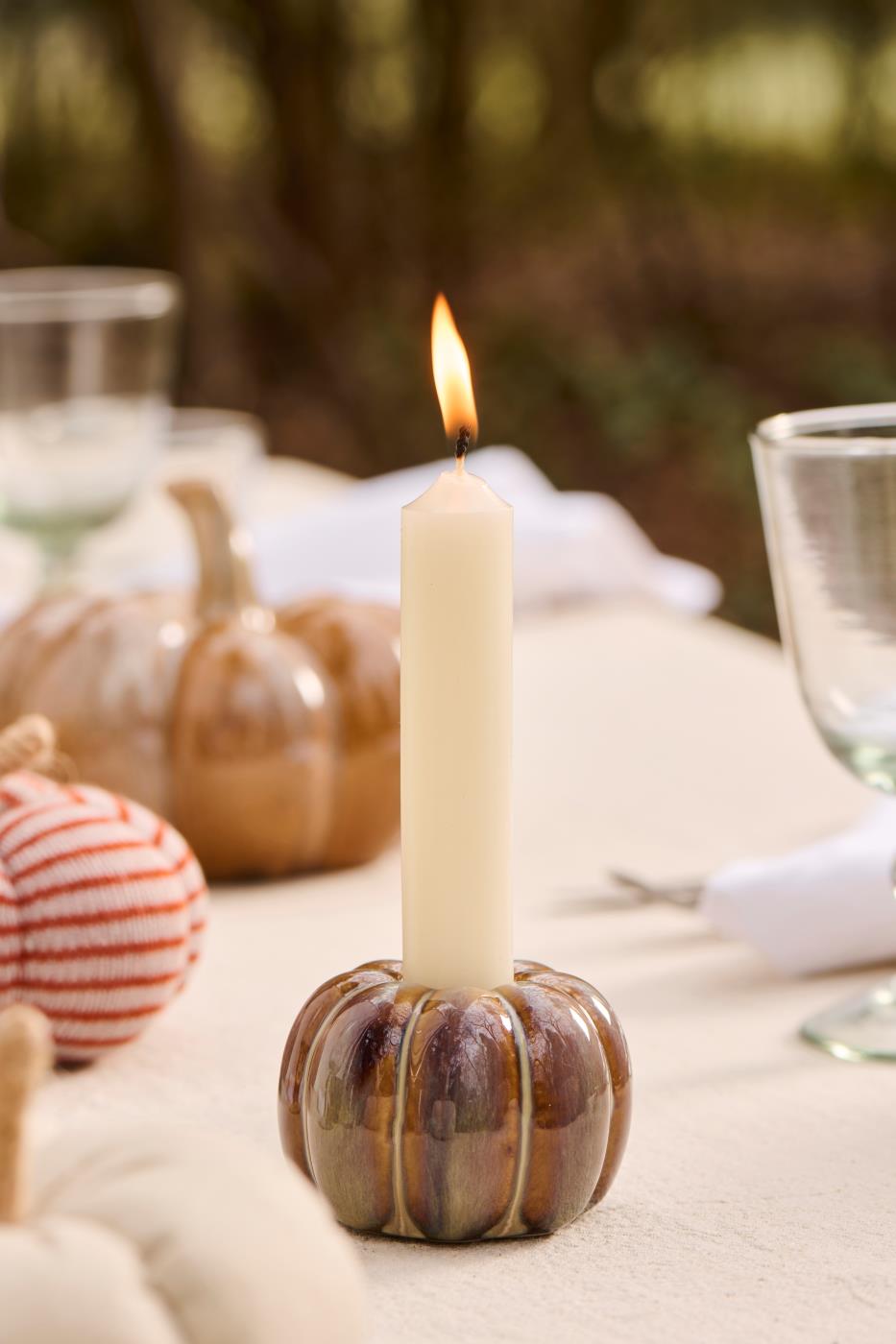 Lysestagformet som en græskar og passer til almindelige kronelys eller de kortere bedelys. Brug den som et charmerende element til din "hygge" i stue, måske suppleret med noget grønt fra naturen eller med de dekorative græsker, der også fåes her på siden.