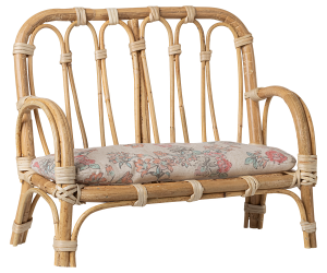 Flot rattan bænk til dine Maileg dyr. Den passer godt til kaniner i str. 3, men alle dine Maileg venner vil elske at side i den. Den er også en hynde med et småblomstret betræk, så alle kan sidde godt. Rattan er et naturprodukt, så variationer kan forekomme.