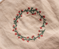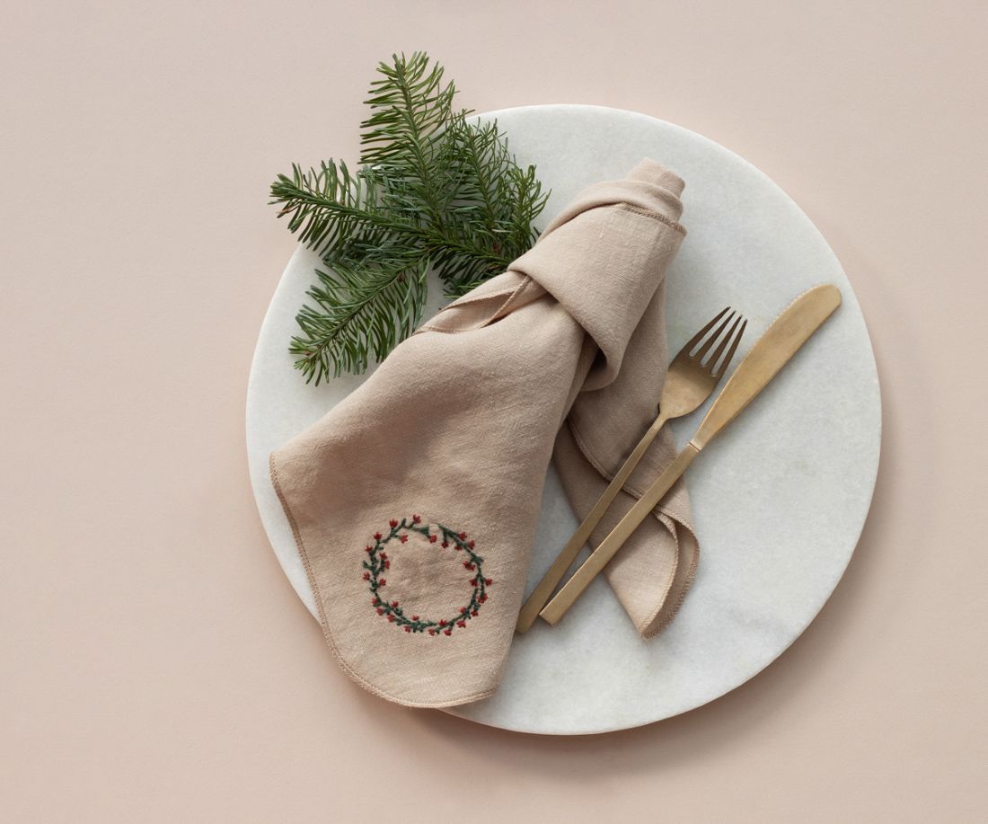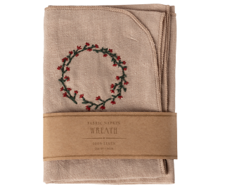 En rigtig fin juleserviet i 100% hør og med et smukt broderi af en krans med røde bær, som er håndtegnet ag Dorthe Malil. Vil pynte på ethvert julebord.
