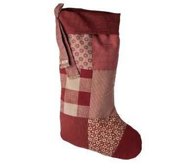 December er en måned, hvor der skal hygges max og gives små gerne. Det kan den fine julestrømpe bruges til - både til små og store. Den er smukt lavet i forskellige stykker stof med blomster, tern og striber i røde nuancer. Øverst er der et ombuk og et bånd med en løkke til ophæng. På båndet er det et fint Maileg logo. En fin sag, som kan gemmes og tages frem igen hvert år til jul.