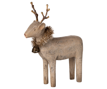 Et smukt rensdyr i træ med et elegant gevir af metal og en fin, naturlig finish. Om halsen hænger en lille juledekoration med klokke, som tilfører et diskret og hyggeligt udtryk.