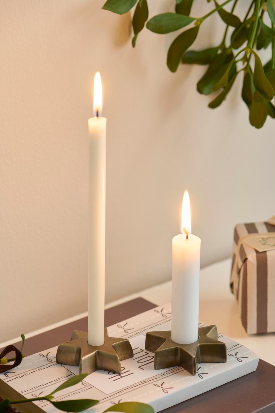 En enkel og dekorativ lysestage formet som en stjerne. Den passer til almindelige kronelys og er smuk alene – men endnu finere, når den samles med andre stager i forskellige former og højder.