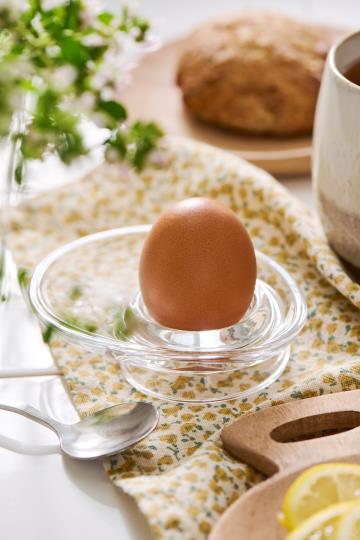 Et fint og enkelt æggebæger i klart glas. Perfekt til morgenbordet og praktisk med den lille sidetallerken, hvor der er plads til æggeskaller eller en skefuld salt.