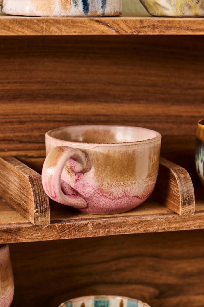 Et hånddrejet keramikkrus med en smuk, levende glasur. Denne variant har en særlig fin farvekombination i rosa og lysebrune nuancer, som flyder blidt sammen og giver kruset et varmt og indbydende udtryk.