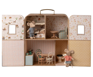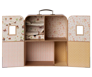 SuitCasa er et bærbart hus til de små mus fra dasnke Maileg. Huset er indrettet rigtig fint med 4 rum, vinduer, forskellige tapeter og så er der køjeseng til lillsøster mus og lillebror mus og også med sengetøj. Du kan tilkøbe flere møbler otil at indrette huset med fx. toilet, køkken, borde og stole. Las fantasien få fuld spil og sæt legen i gang og tag den med på farten.