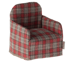 Miniature lænestol, der passer perfekt til de små mus fra Maileg’s fortryllende univers. Lænestolen er beklædt med klassiske røde tern og har et hyggeligt, nostalgisk udtryk, der inviterer til timevis af leg – både fritstående og som en del af et dukkehus.