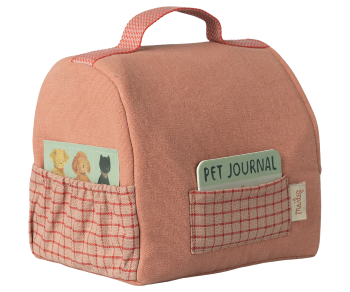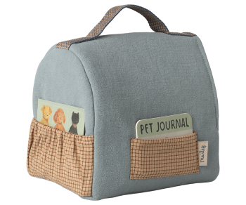 Udvendigt er den ensfarvet og enkel i udtrykket, mens indersiden gemmer på et fint mønstret stof, som giver et hyggeligt og gennemtænkt look. Med tasken følger en lille Pet-journal med klistermærker, hvor du kan skrive sjove fakta og oplysninger om dit kæledyr – en fin detalje, der gør legen endnu mere personlig.