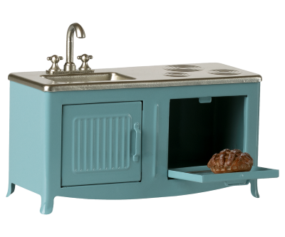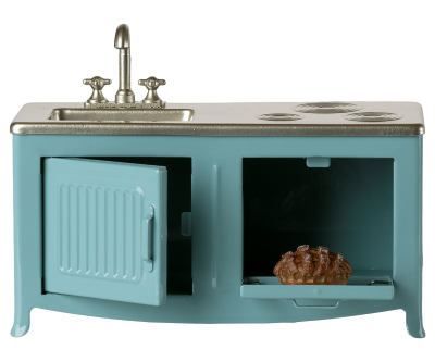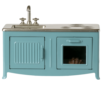 Det fineste lille køkken i en smuk blå farve – skabt i den helt rigtige størrelse til musene fra Mailegs fantastiske univers. Her er der tænkt på detaljerne: låger der kan åbnes, håndvask med armatur og en ovn, hvor der allerede står en tærte klar.