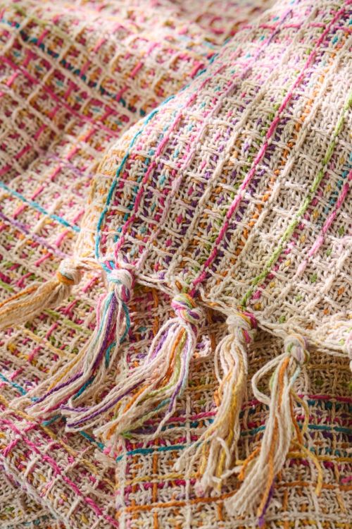 Vævet tæppe i blød bomuld med fine, friske farver og smalle striber, der changerer smukt over i hinanden, samt dekorative frynser i enderne. Et tæppe er altid godt at have ved hånden – uanset om det bruges i sofaen, på terrassen, i sommerhuset eller tages med på farten i bilen.
