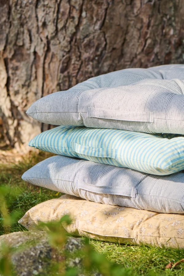 Madras i klassiske mørkeblå striber med en tyk polstring, der giver høj komfort og god støtte. Stoffet er blødt bomuld, som føles behageligt mod huden, og madrassen kan nemt aftørres, hvilket gør den praktisk i hverdagen. Brug den som loungemadras på terrassen, som liggeunderlag på græsset, som ekstra gulvmadras eller på en bred bænk, når du vil skabe en afslappet og hyggelig stemning både inde og ude.