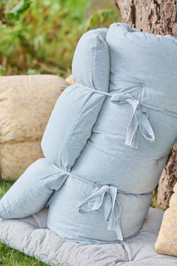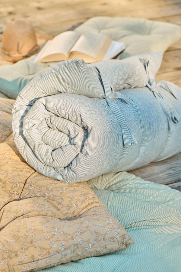 Madrassen kan rulles sammen og bindes med de to medfølgende snore, så den er let at opbevare og nem at tage med. De mørkeblå striber giver et tidløst, friskt og sommerligt udtryk, der passer perfekt til nordisk indretning og udemiljøer. En praktisk og dekorativ madras, der kombinerer funktion, komfort og stil.