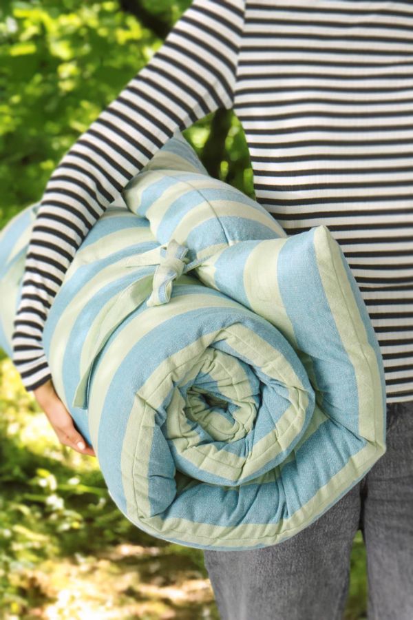 Madrassen kan rulles sammen og bindes med de to medfølgende snore, så den er let at opbevare og nem at tage med. De sommerlige farver giver et friskt og indbydende udtryk, der passer perfekt til både inde- og udendørs indretning.