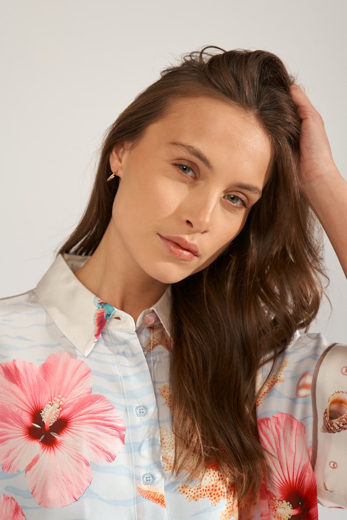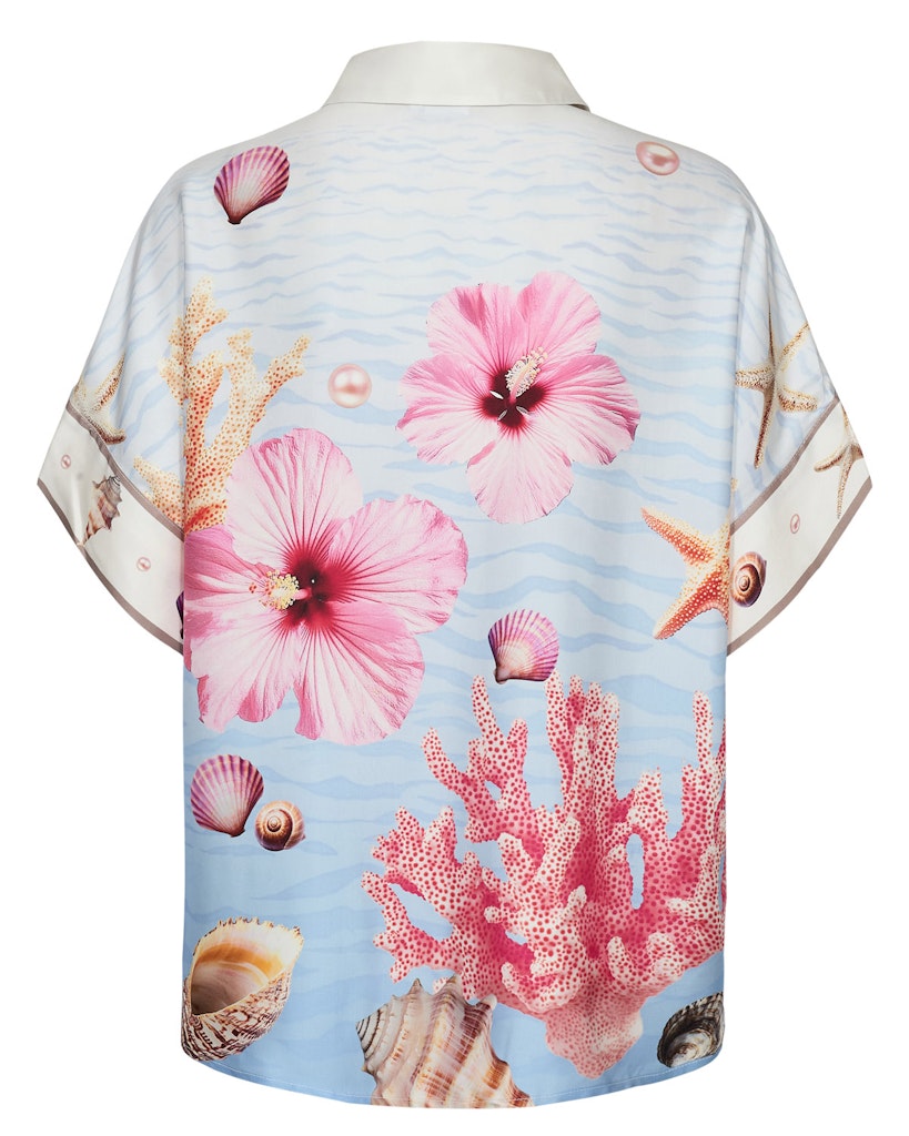 Mønstret leder tankerne mod havets dyb, hvor du opdager de smukke farver og det levende univers med koraller, små fisk, søstjerner og muslinger. Ærmerne afsluttes med en bred bort, ligeledes dekoreret med havinspirerede motiver, som giver skjorten en smuk og harmonisk afslutning.
