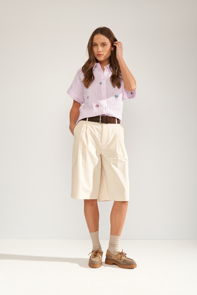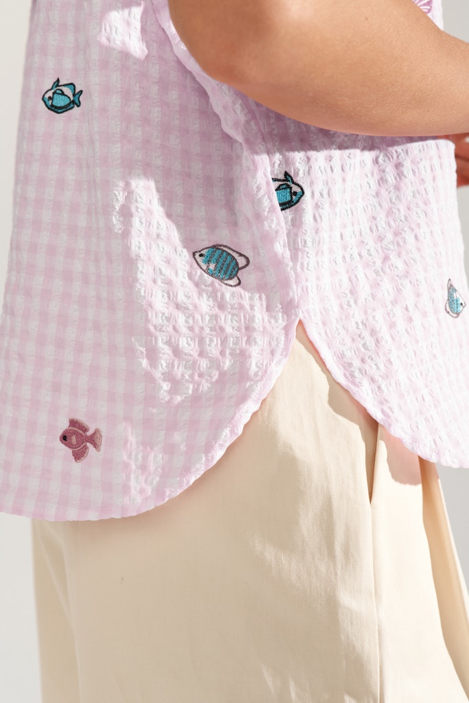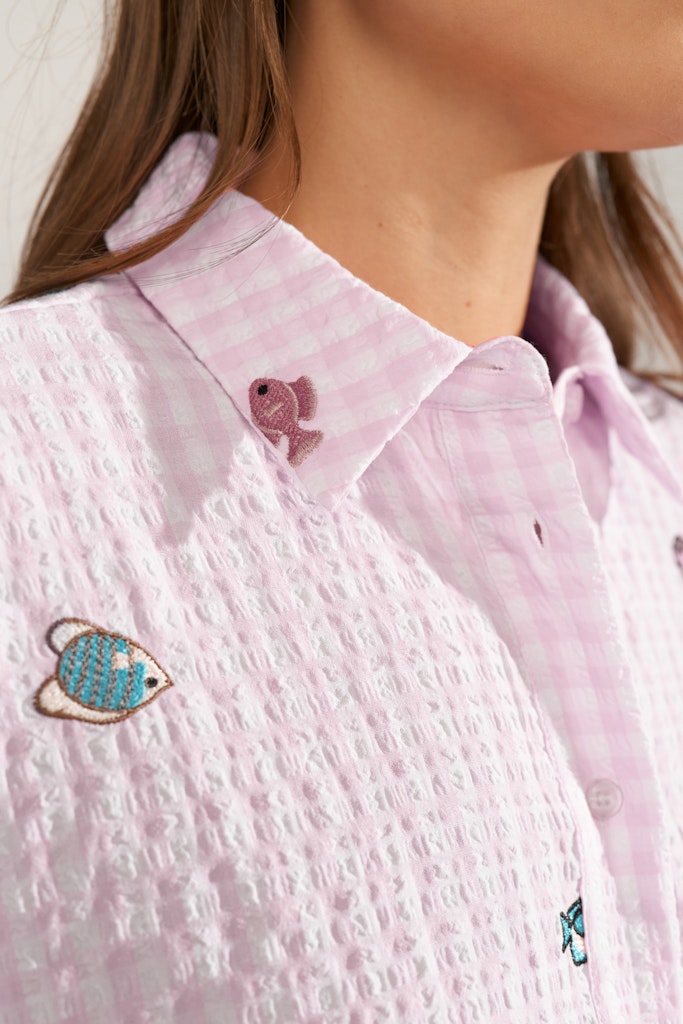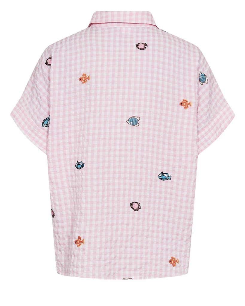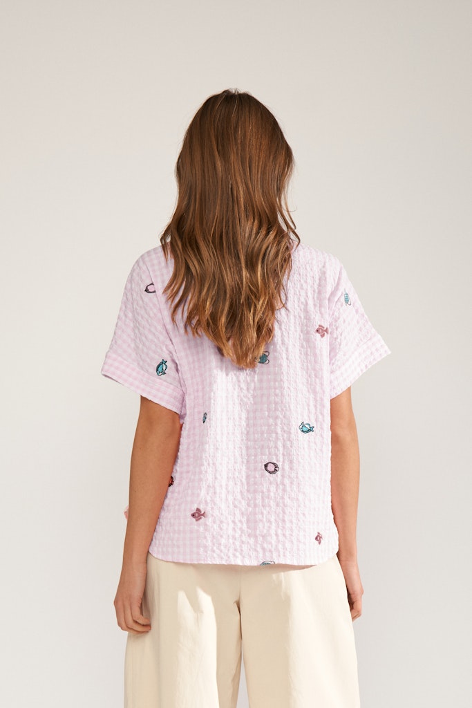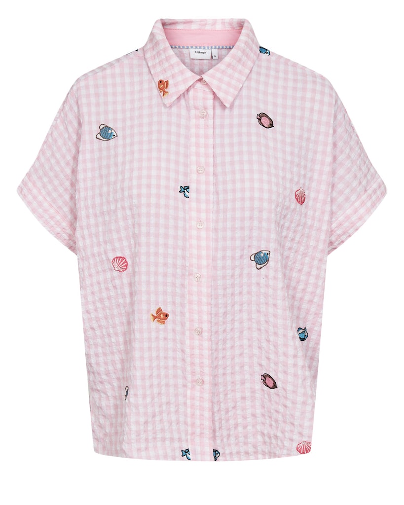 Fin og feminin skjorte fra NÜMPH i nedtonede lyserøde tern, smukt kombineret med delikate broderier inspireret af livet i havet all‑over. De små broderede motiver giver skjorten et poetisk og levende udtryk, mens farven rosa tilfører et blødt og feminint strejf.