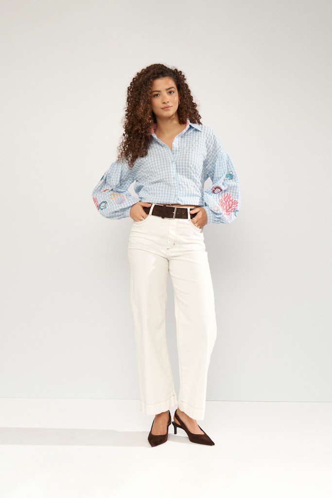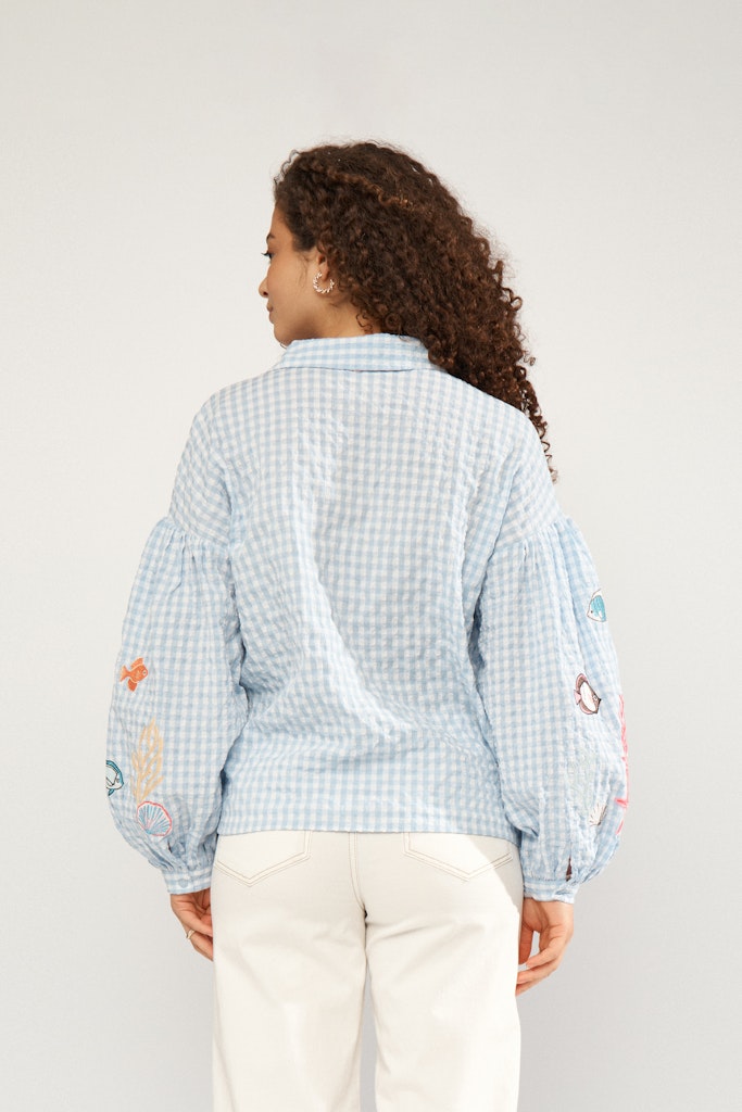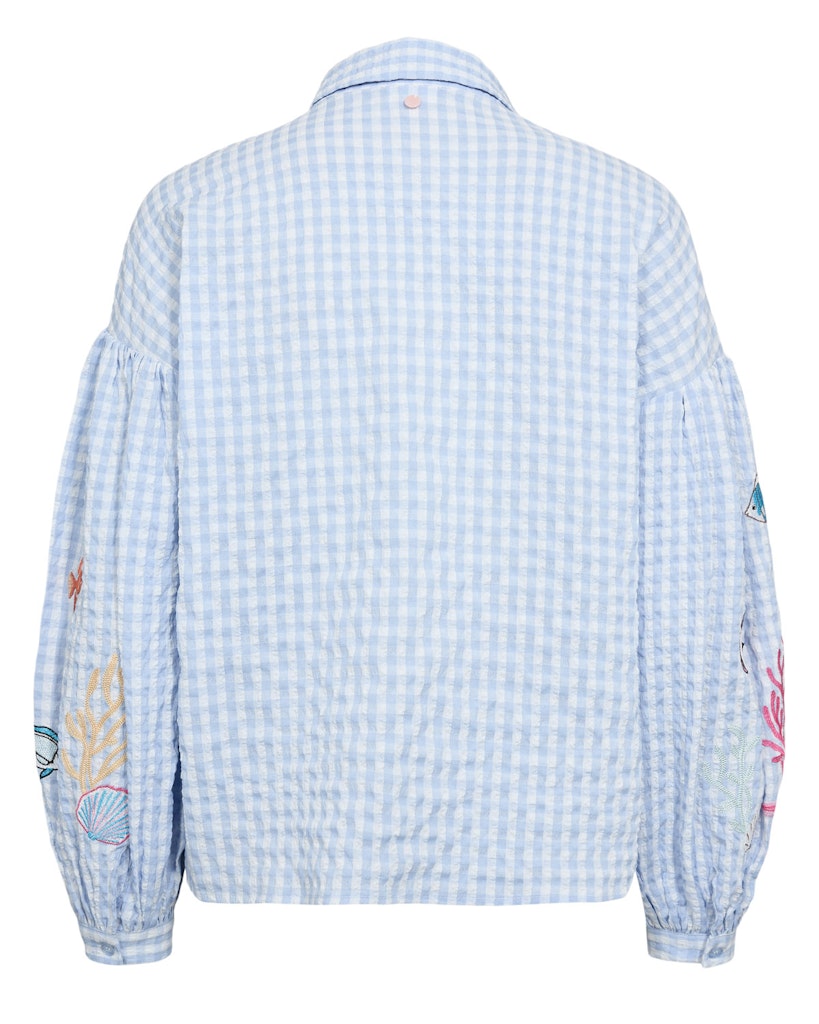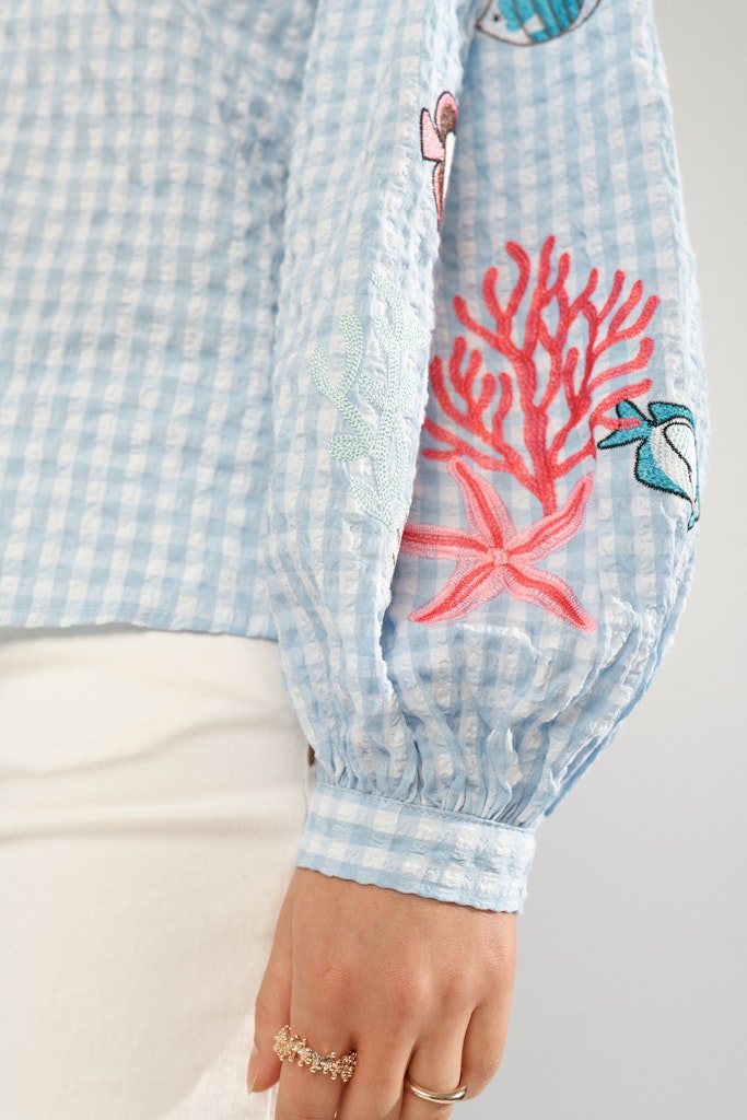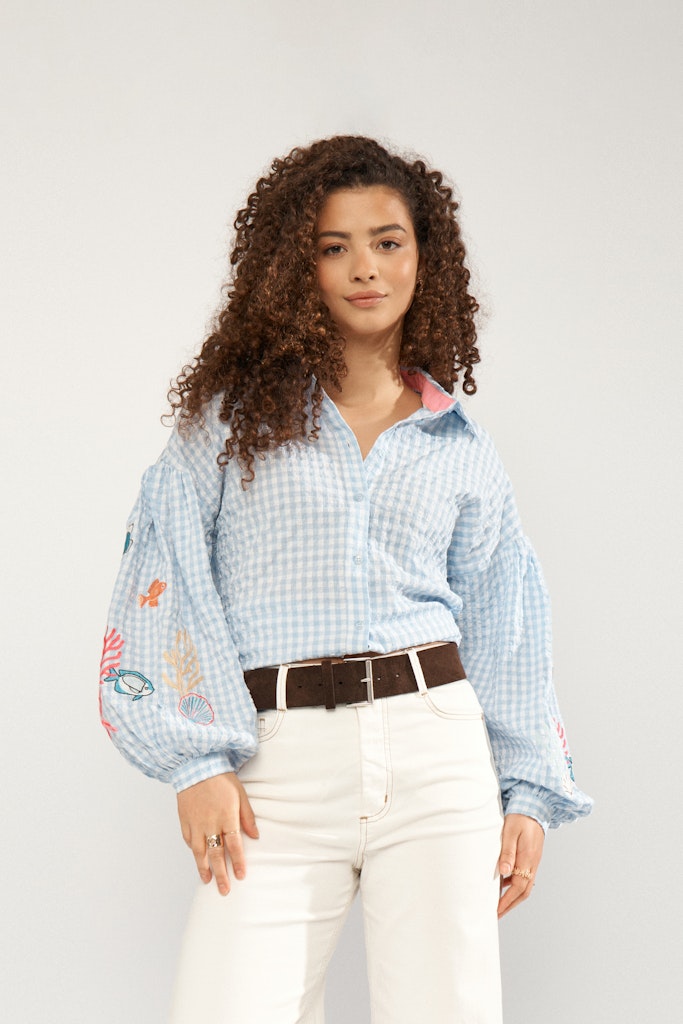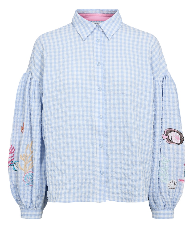 Fin og feminin skjorte fra NÜMPH i nedtonede lyseblå tern, smukt kombineret med delikate broderier inspireret af livet i havet på de lange ærmer. De små broderede motiver giver skjorten et poetisk og levende udtryk, mens den lyseblå farve tilfører et roligt, friskt og feminint præg.