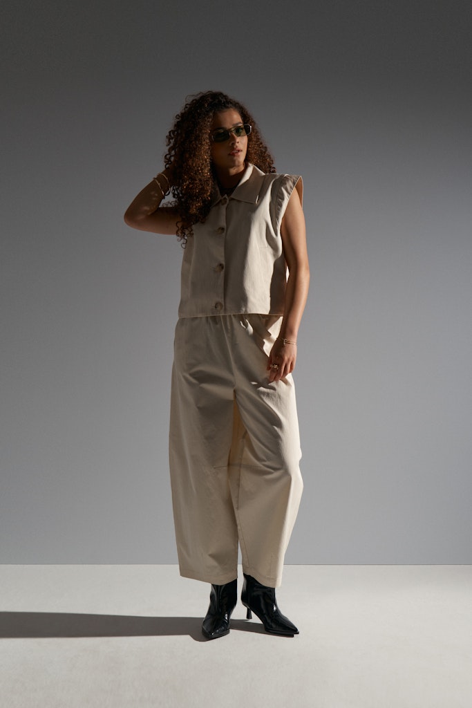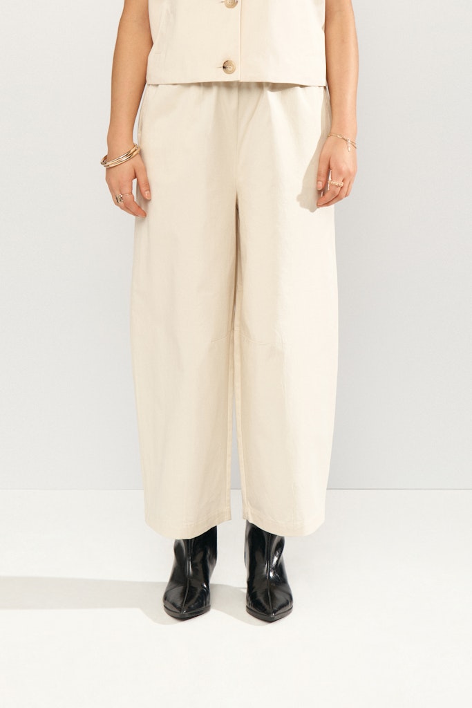 Elegant buks med cropped længde og et afdæmpet, sofistikeret udtryk. Det velafstemte snit kombinerer rene linjer med moderne detaljer, hvilket giver et roligt og gennemført look. Bukserne har lige ben med en diskret indsnævring forneden samt et elegant læg ved knæene, der tilfører struktur og bevægelse uden at virke tungt.