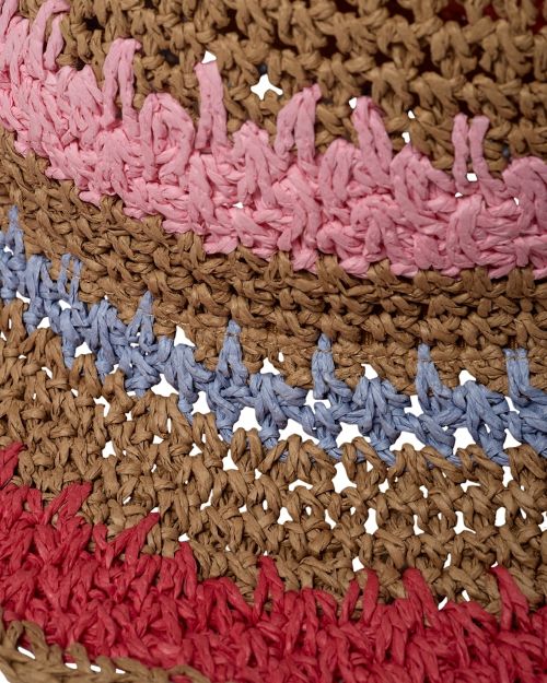Sommerhat med striber i smukke, solvarme farver, der emmer af afslappet boheme og feriestemning. Hatten er hæklet i papirgarn, hvilket giver et let, luftigt udtryk og en naturlig struktur, der passer perfekt til varme sommerdage.