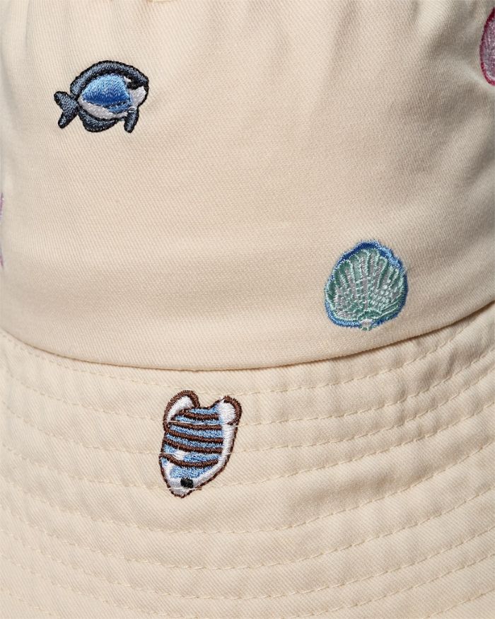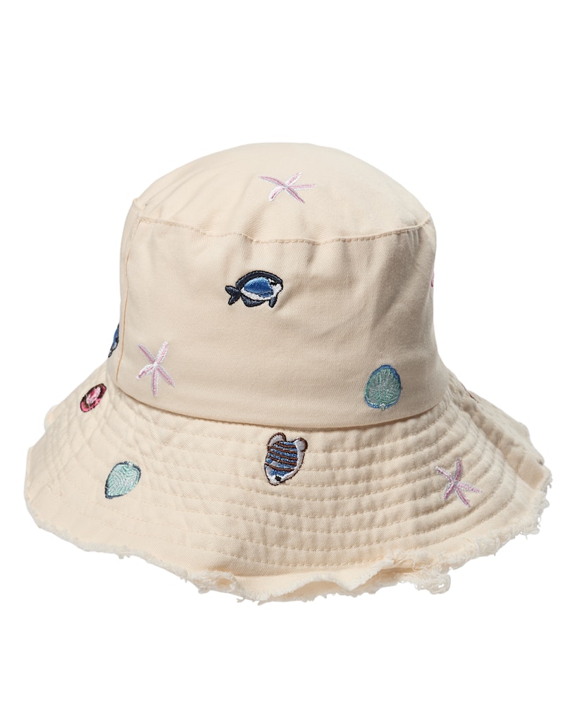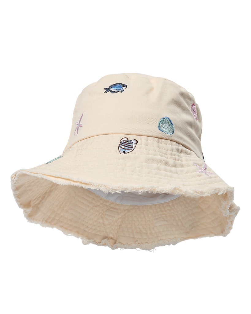 Skøn bucket hat med flotte broderier inspireret af livet ved havet – muslinger, små fisk, skaller og andre fine maritime detaljer. Broderierne giver hatten et legende og personligt udtryk med klare referencer til sommer, strand og hav.