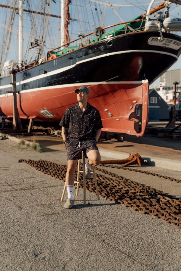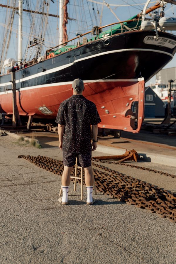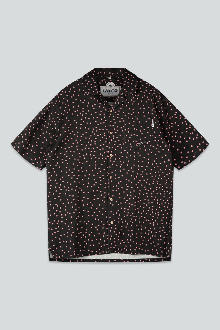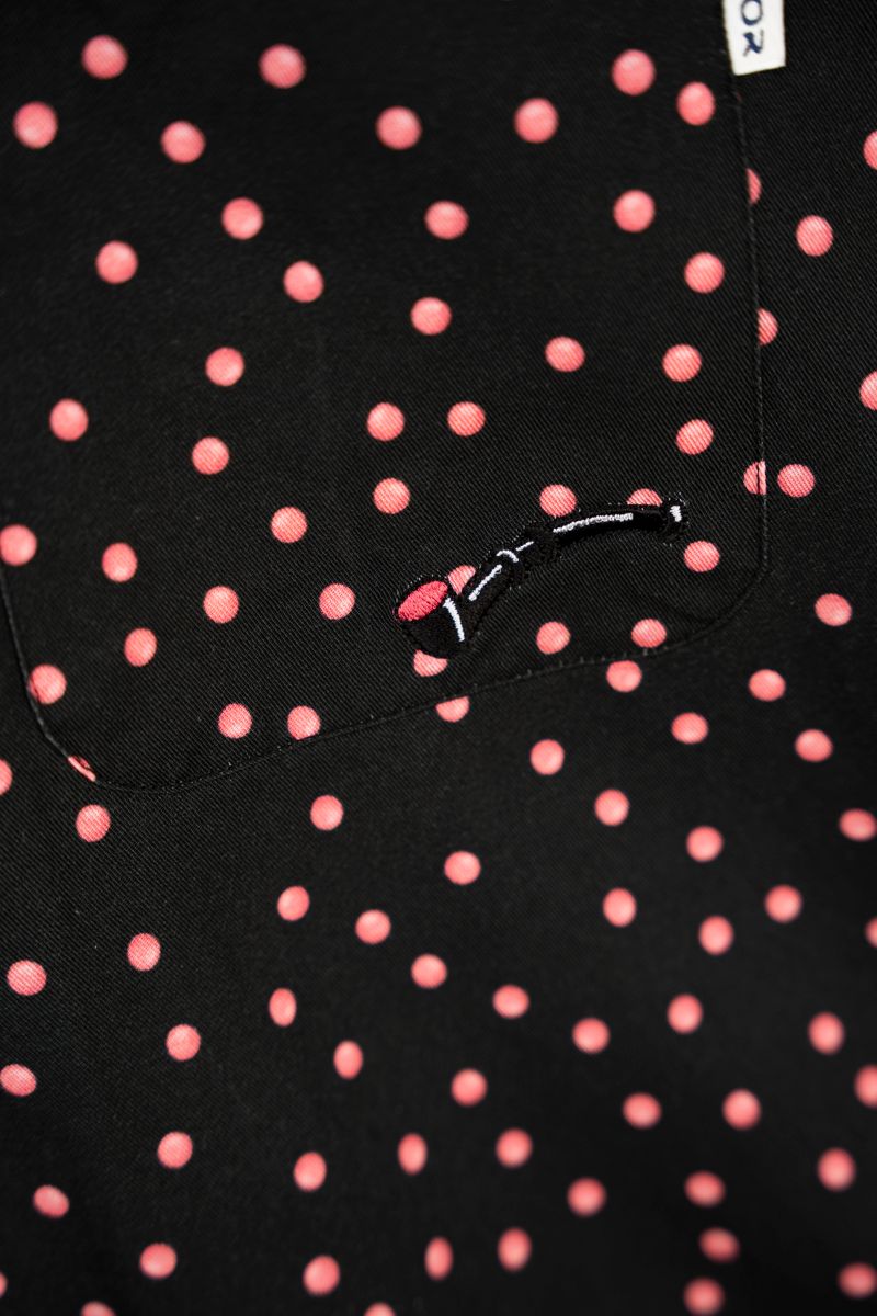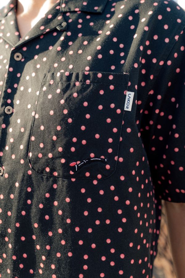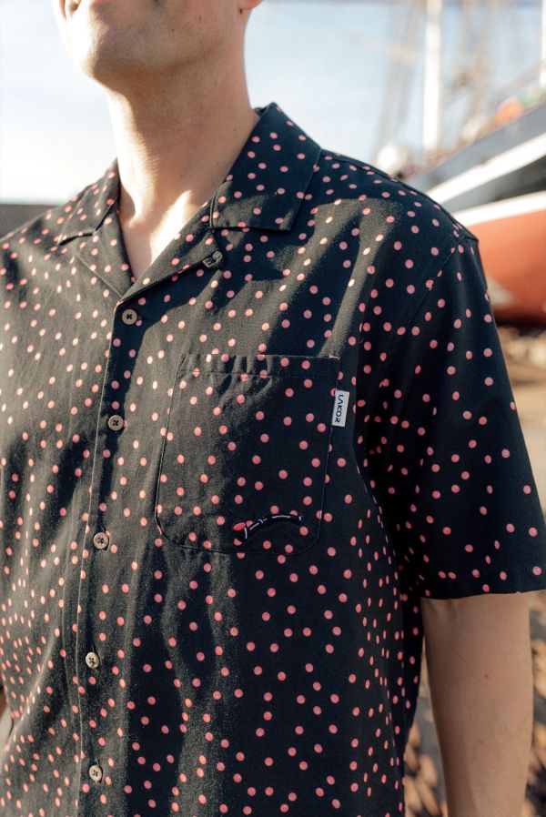 Designet er gennemført ned til mindste detalje med brystlomme, små slidser i begge sider nederst og knapper lavet af kokosnød, som understreger den naturlige og afslappede stil. På brystlommen finder du et lille broderi af en lakridspibe, og de fine prikker i stoffet symboliserer det lyserøde krymmel på piben – et humoristisk og genkendeligt LAKOR‑twist.