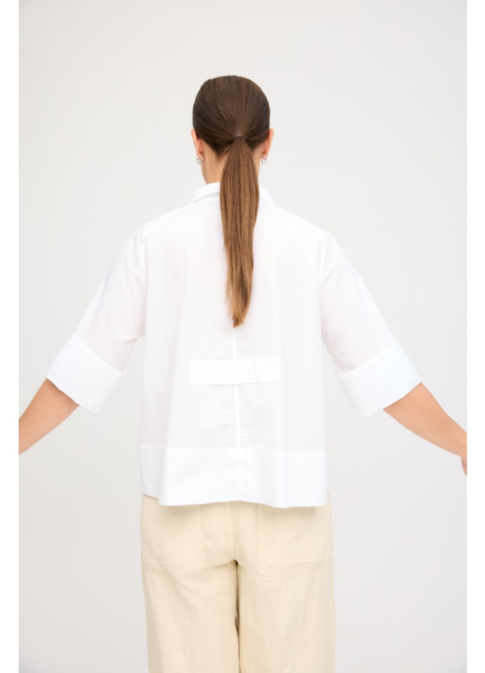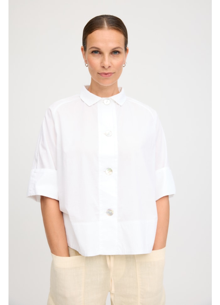 Flot skjorte/jakke i en dejlig bomuldspoplin med en smule elastan, som giver ekstra komfort og bevægelsesfrihed. Modellen har en klassisk krave, der ligger pænt ned, og er gennemknappet foran med store, flotte perlemorsknapper, som tilfører et elegant og raffineret udtryk.
