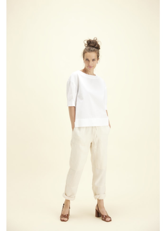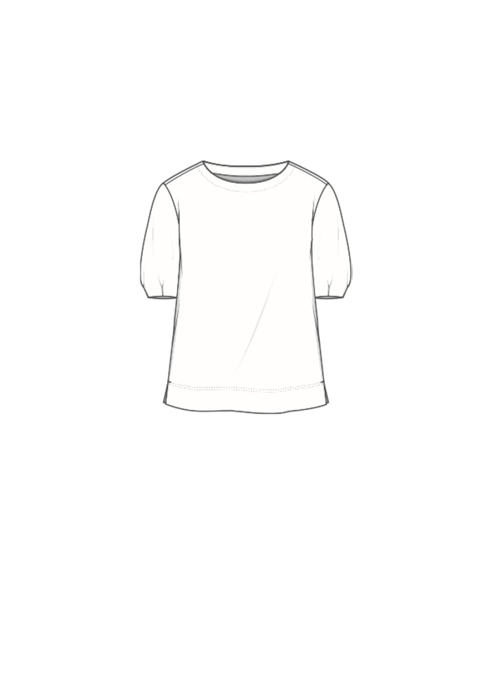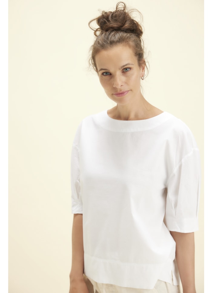 Pasformen har en let A‑shape, der falder flot og feminint. Nederst afsluttes skjorten med en bred kant i dobbelt stof samt en lille slids i hver side, som giver ekstra bevægelsesfrihed og et let, afslappet fald. Ærmerne er korte og har en særlig detalje med to små pynkelæg i siden, som tilfører et diskret, feminint touch.