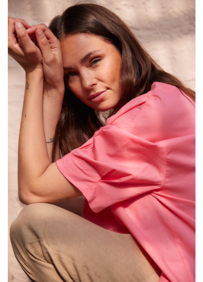 Pasformen har en let A‑shape, der falder flot og feminint. Nederst afsluttes skjorten med en bred kant i dobbelt stof samt en lille slids i hver side, som giver ekstra bevægelsesfrihed og et let, afslappet fald. Ærmerne er korte og har en særlig detalje med to små pynkelæg i siden, som tilfører et diskret, feminint touch.