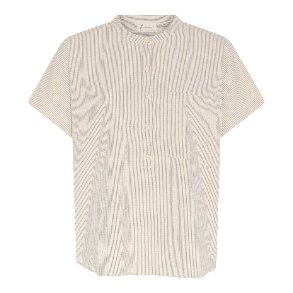 Skjorten fra FRAU er kortærmet og designet med kinakrave og en lille stolpelukning foran på brystet. Modellen er uden skulderskæring, hvilket giver bedre bevægelighed og en afslappet pasform. En enkel påsyet lomme på brystet fuldender udtrykket, som fremstår rent, nordisk og minimalistisk.