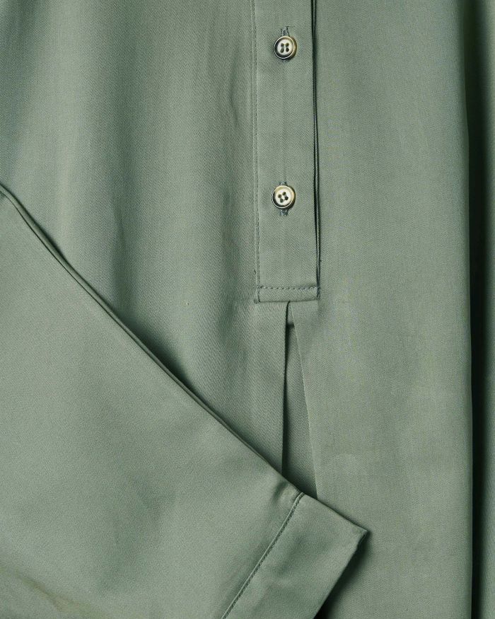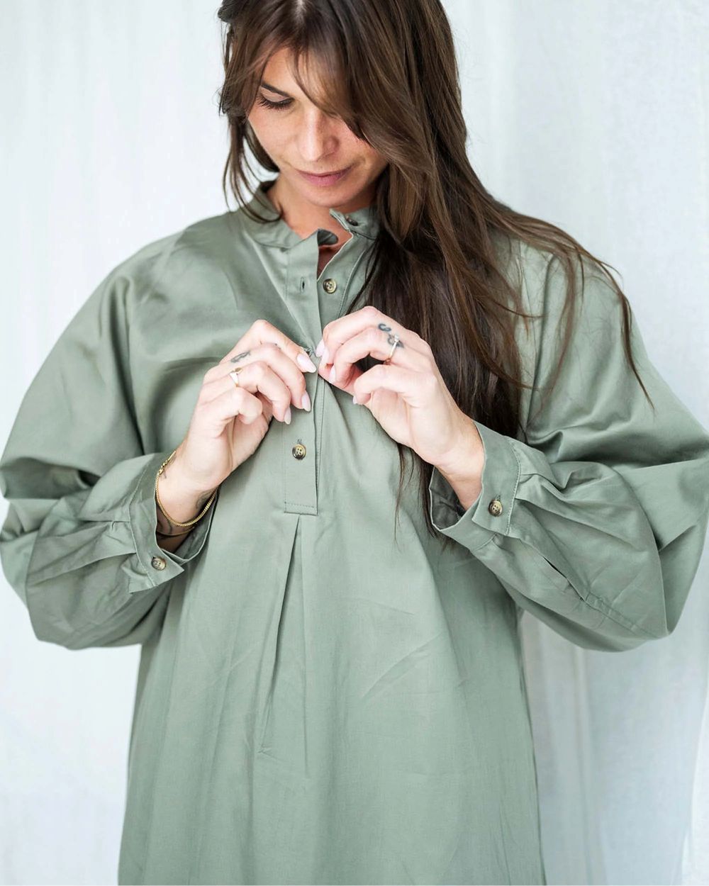 Modellen er onesize og passer ca. str. 36–44, afhængigt af kropsform og ønsket pasform. Kjolen har en kinakrave og halv stolpelukning foran, som giver et enkelt og sofistikeret udtryk. De lange ærmer afsluttes med en smal manchet, og i siderne findes skjulte indvendige lommer, som giver ekstra funktionalitet i hverdagen.