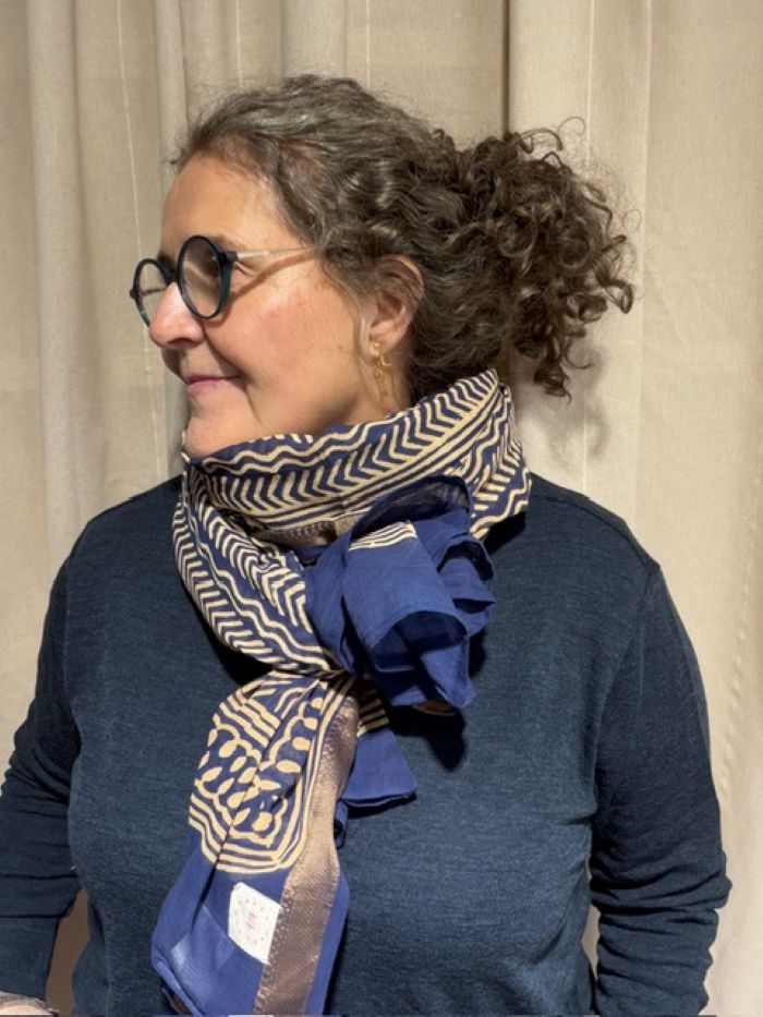 Mønstret er skabt med traditionelt håndlavet bloktryk, hvor udskårne træblokke dyppes i farve og nænsomt presses mod stoffet. Teknikken har sine rødder i Rajasthan i Indien og bærer generationers håndværk med sig. Hvert tørklæde er derfor helt unikt – små variationer i farve og tryk er en naturlig del af processen og netop dét, der giver tørklædet karakter, liv og sjæl.