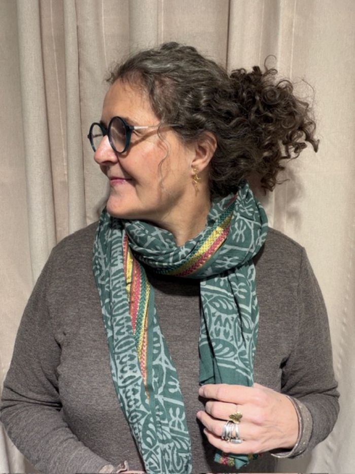 Mønstret er skabt med traditionelt håndlavet bloktryk, hvor udskårne træblokke dyppes i farve og presses forsigtigt mod stoffet. Teknikken stammer fra Rajasthan i Indien og bærer århundreders håndværk med sig. Hvert tørklæde er derfor helt unikt – små variationer i farve og tryk er en naturlig del af processen og netop dét, der giver karakter, sjæl og autenticitet.