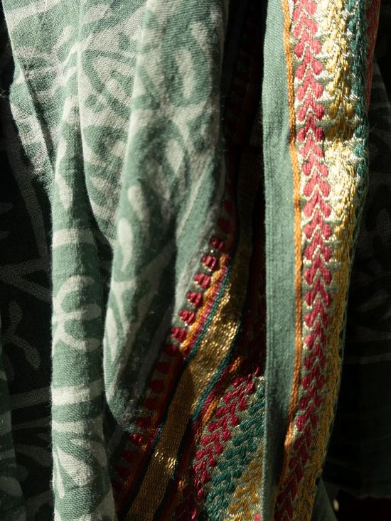 Stort og let boheme‑tørklæde i 100 % bomuld, nænsomt håndlavet i Indien og beriget med fine gyldne detaljer, der fanger lyset på smukkeste vis. Den bløde, luftige kvalitet gør tørklædet ideelt at svøbe løst om halsen, drapere over skuldrene eller binde nonchalant om hofterne på lune sommerdage.