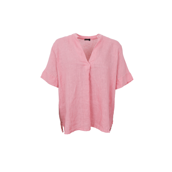 Blusen har V‑hals, korte ærmer og en lille slids nederst i hver side, som giver et let og behageligt fald. Hørkvaliteten er særligt velegnet til varme dage, da materialet er åndbart og naturligt kølende, hvilket gør blusen ekstra behagelig at have på om sommeren.