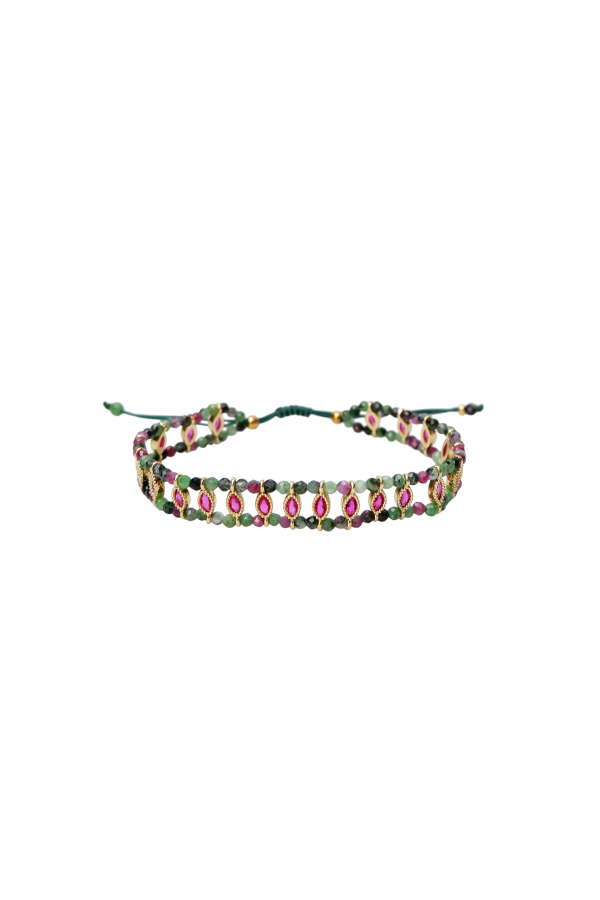 Håndlavet boheme‑armbånd med naturperler, hvor stenene primært er holdt i grønne nuancer, som giver smykket et roligt, jordnært og levende udtryk. De grønne sten skaber et smukt, organisk farvespil, mens de gyldne detaljer tilfører varme og et let, solkysset boho‑touch.