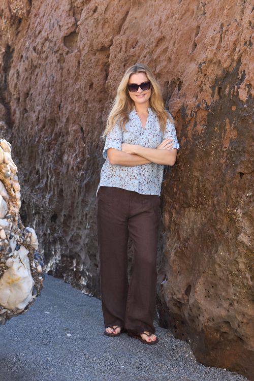 Blusen har V‑hals, korte ærmer og en lille slids nederst i hver side, som giver et let og behageligt fald. Hørkvaliteten er særligt velegnet til varme dage, da materialet er åndbart og naturligt kølende, hvilket gør blusen ekstra behagelig at have på om sommeren.