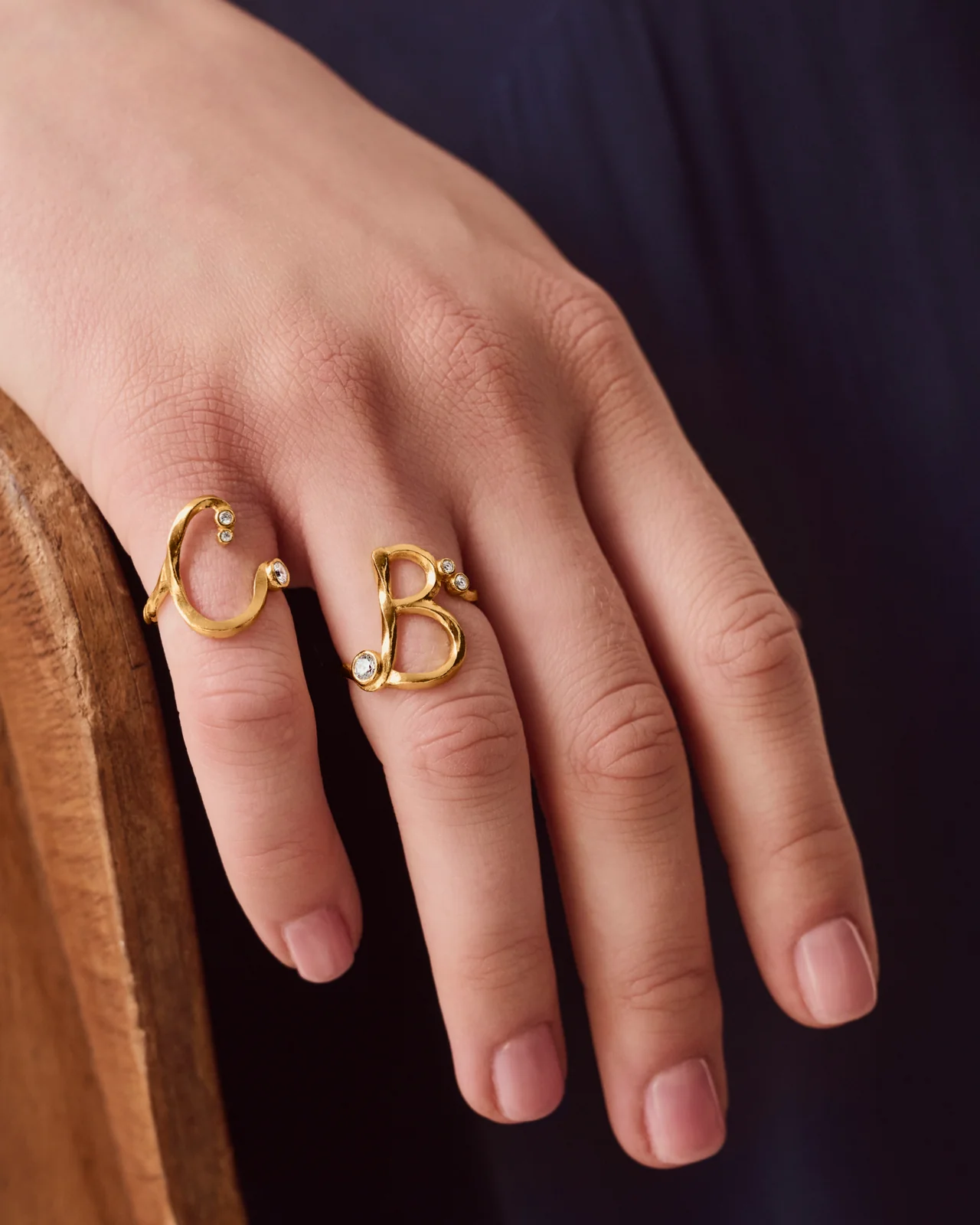 Alfabetringene har bløde, organiske former og er håndformede, hvilket gør dem både iøjnefaldende og personlige, når de bæres på fingeren. Ét enkelt bogstav kan sige det hele – en hyldest til én, du holder af, eller et symbol på dig selv.
