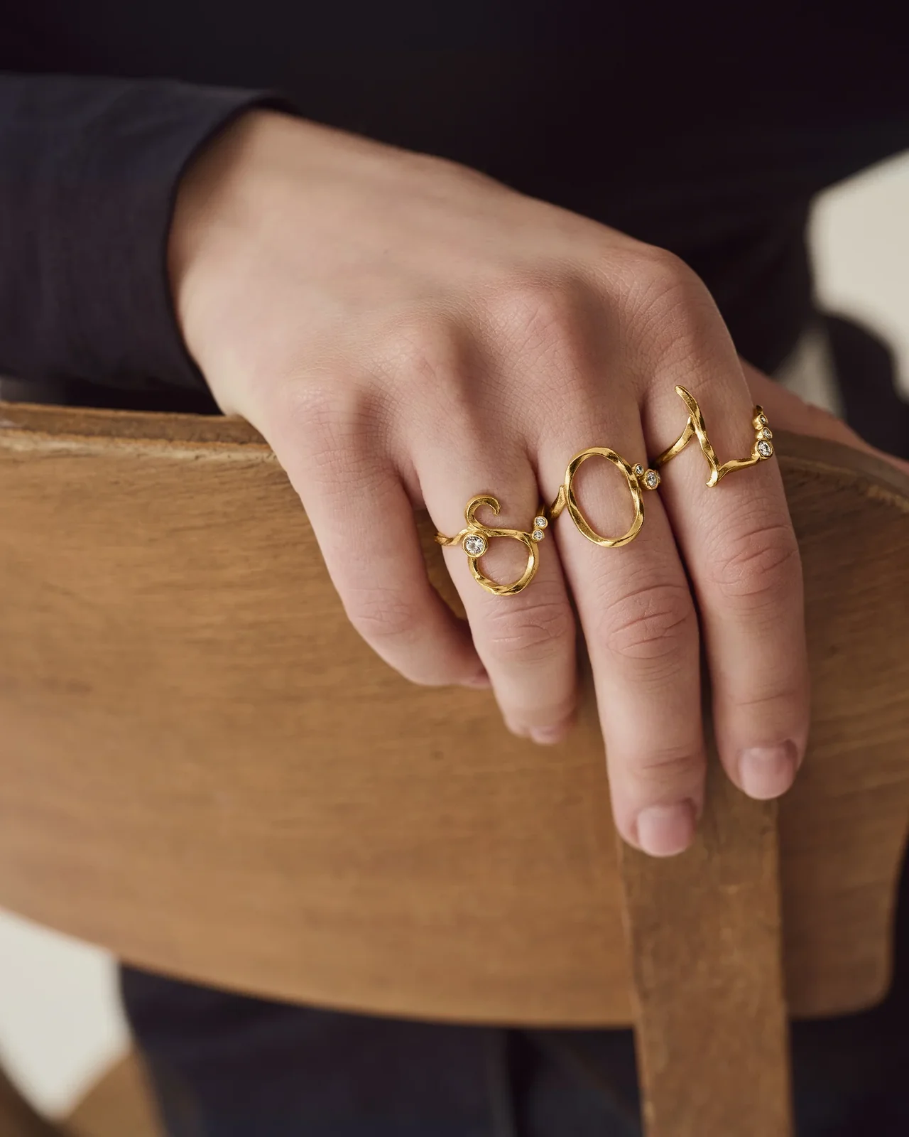 Alfabetringene har bløde, organiske former og er håndformede, hvilket gør dem både iøjnefaldende og personlige, når de bæres på fingeren. Ét enkelt bogstav kan sige det hele – en hyldest til én, du holder af, eller et symbol på dig selv.