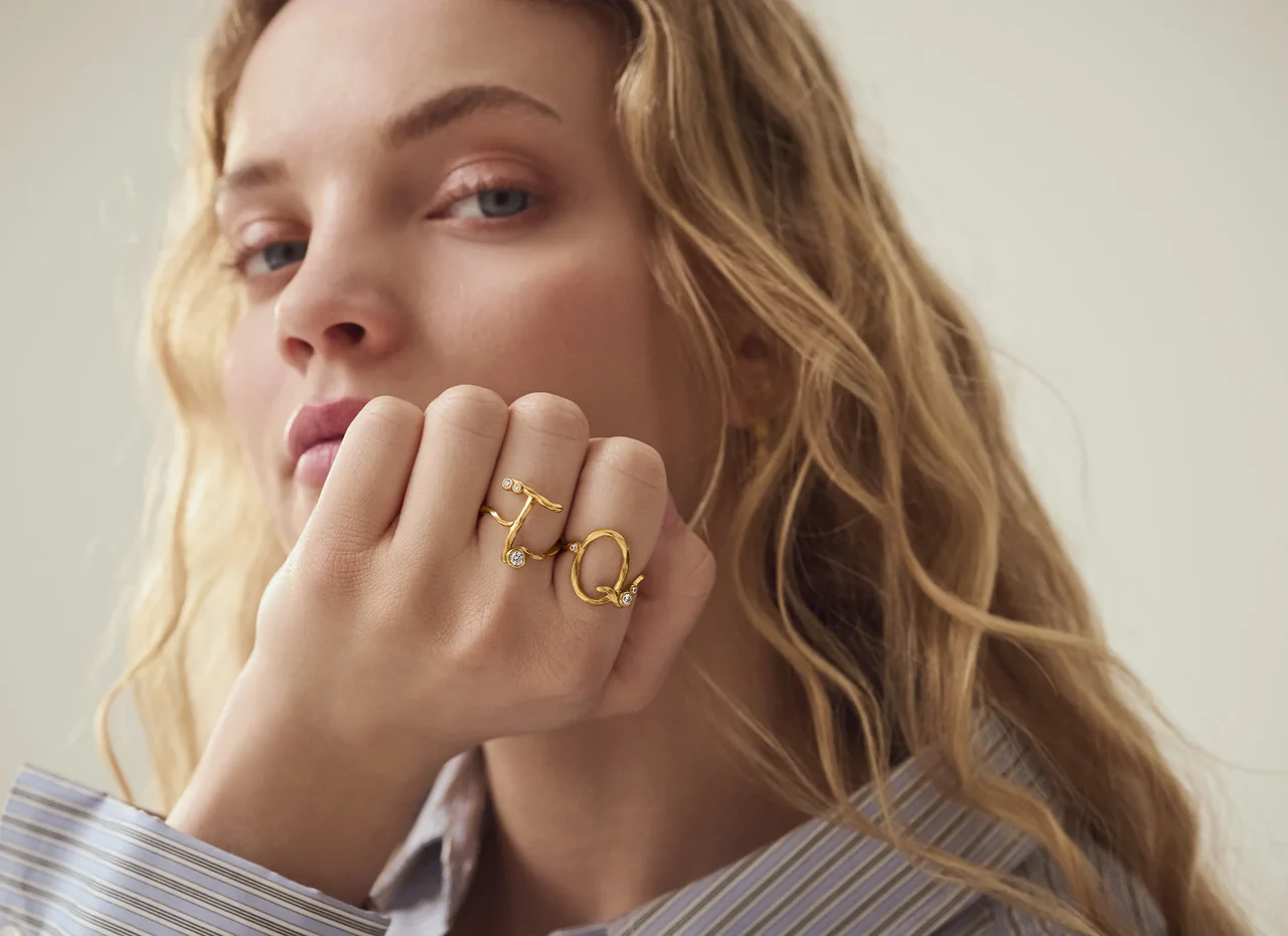 Alfabetringene har bløde, organiske former og er håndformede, hvilket gør dem både iøjnefaldende og personlige, når de bæres på fingeren. Ét enkelt bogstav kan sige det hele – en hyldest til én, du holder af, eller et symbol på dig selv.
